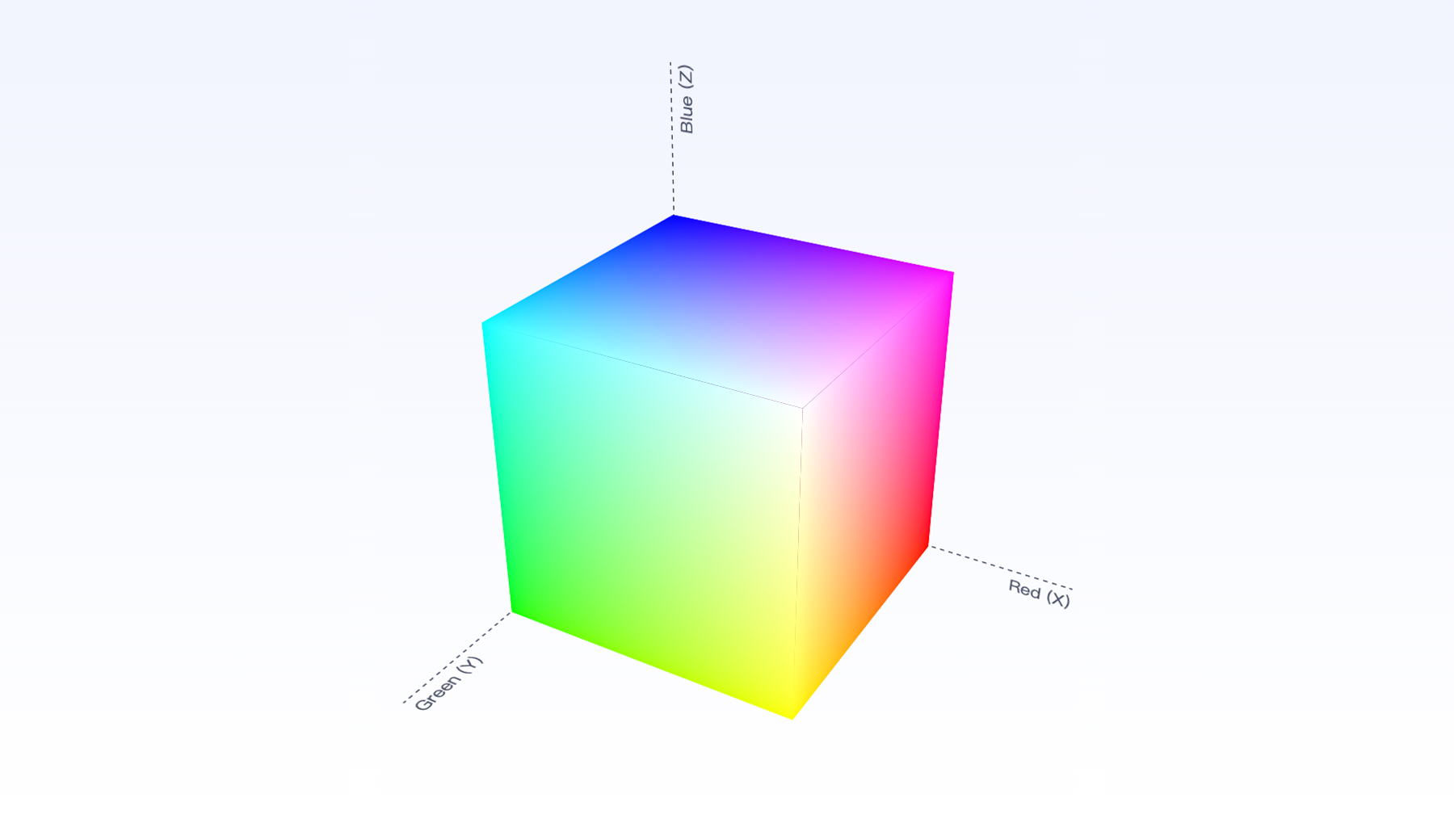 想象一个三维直角坐标系,它的XYZ轴分别是RGB轴,那么色彩空间就可以表示为: